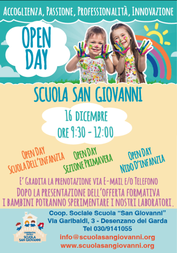 Sabato 3 dicembre dalle ore 10:00 alle ore 12:00 si svolgerà all’interno della Scuola dell’Infanzia un open day, al fine di presentare la nostra realtà scolastica ed i servizi che offre.